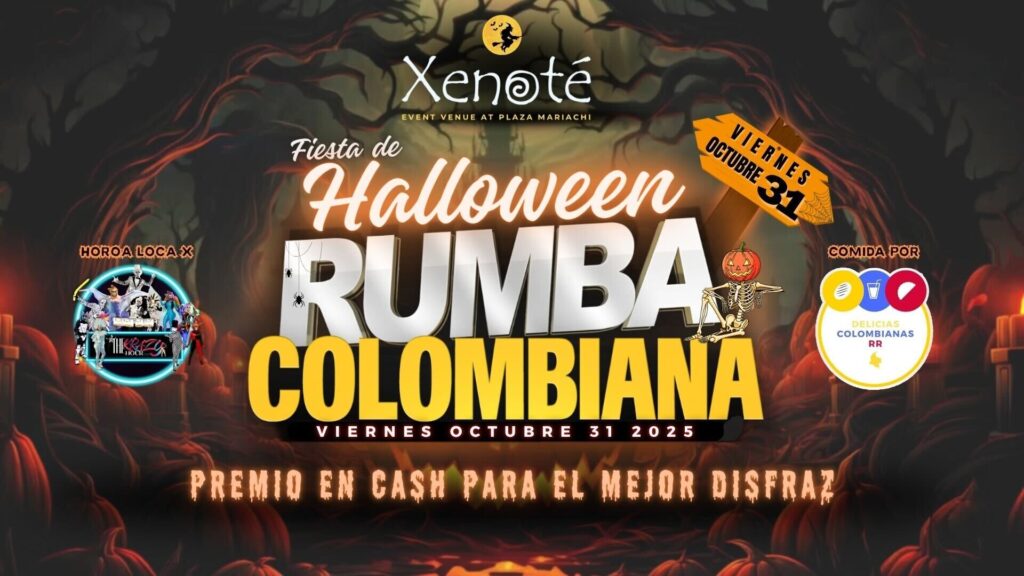 Get ready for a spooky night full of Colombian rhythm, dance, and celebration! Join us inside Xenote at Plaza Mariachi for the Halloween Rumba Colombiana, a night of vibrant music, costumes, and Latin energy.