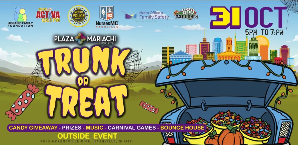 Trunk or Treat returns to Plaza Mariachi this year in cooperation with the Hispanic Family Foundation and the Metro Nashville Police Department. There will be a candy give away, prizes, music, carnival games, bounce house, and more. This event will be inside and outside between 5pm-7pm. This will be a memory filled and fun event for the whole family.