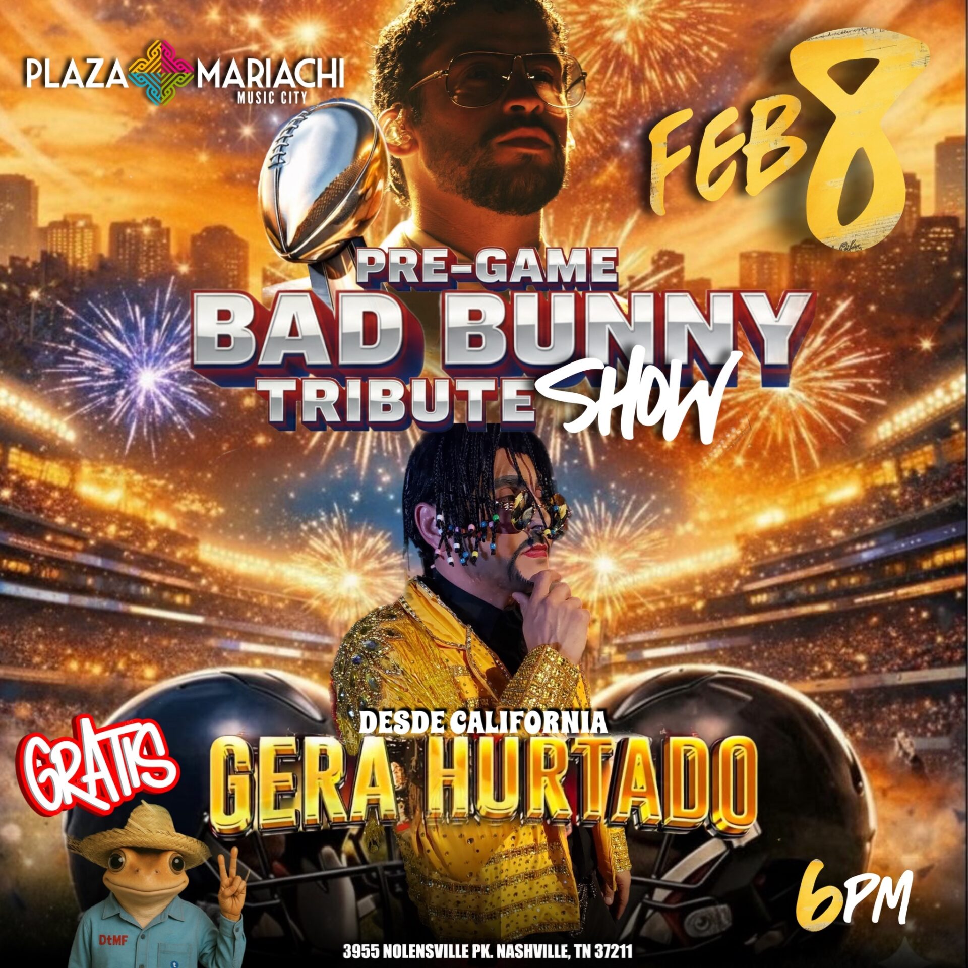 The Bad Bunny Tribute Show at Plaza Mariachi 🏈🎉 Get ready for the ultimate Bad Bunny Tribute Show and The Big Game experience at Plaza Mariachi! Join us on Sunday, February 8, 2026, at 6 PM in Game Alley to...